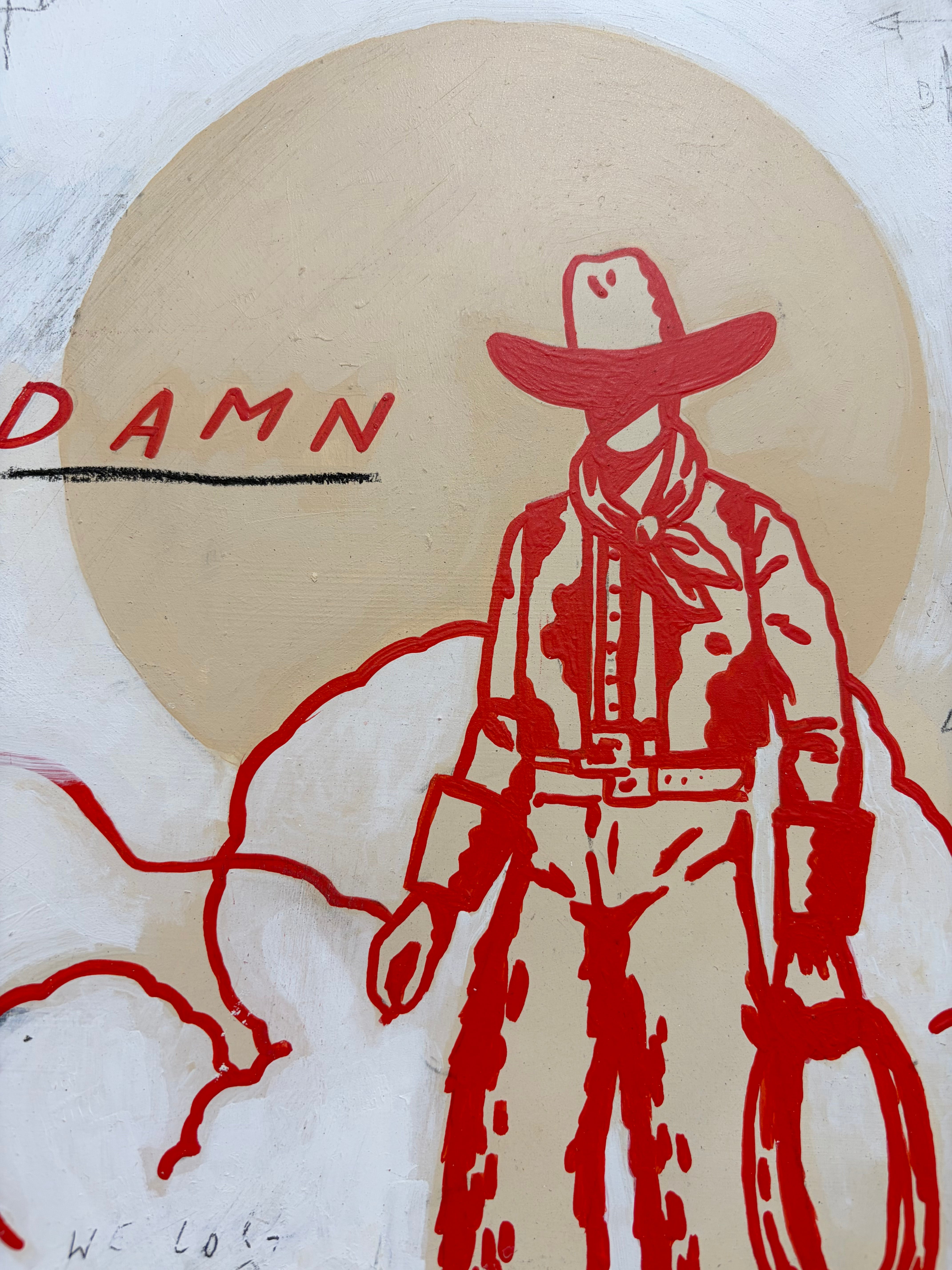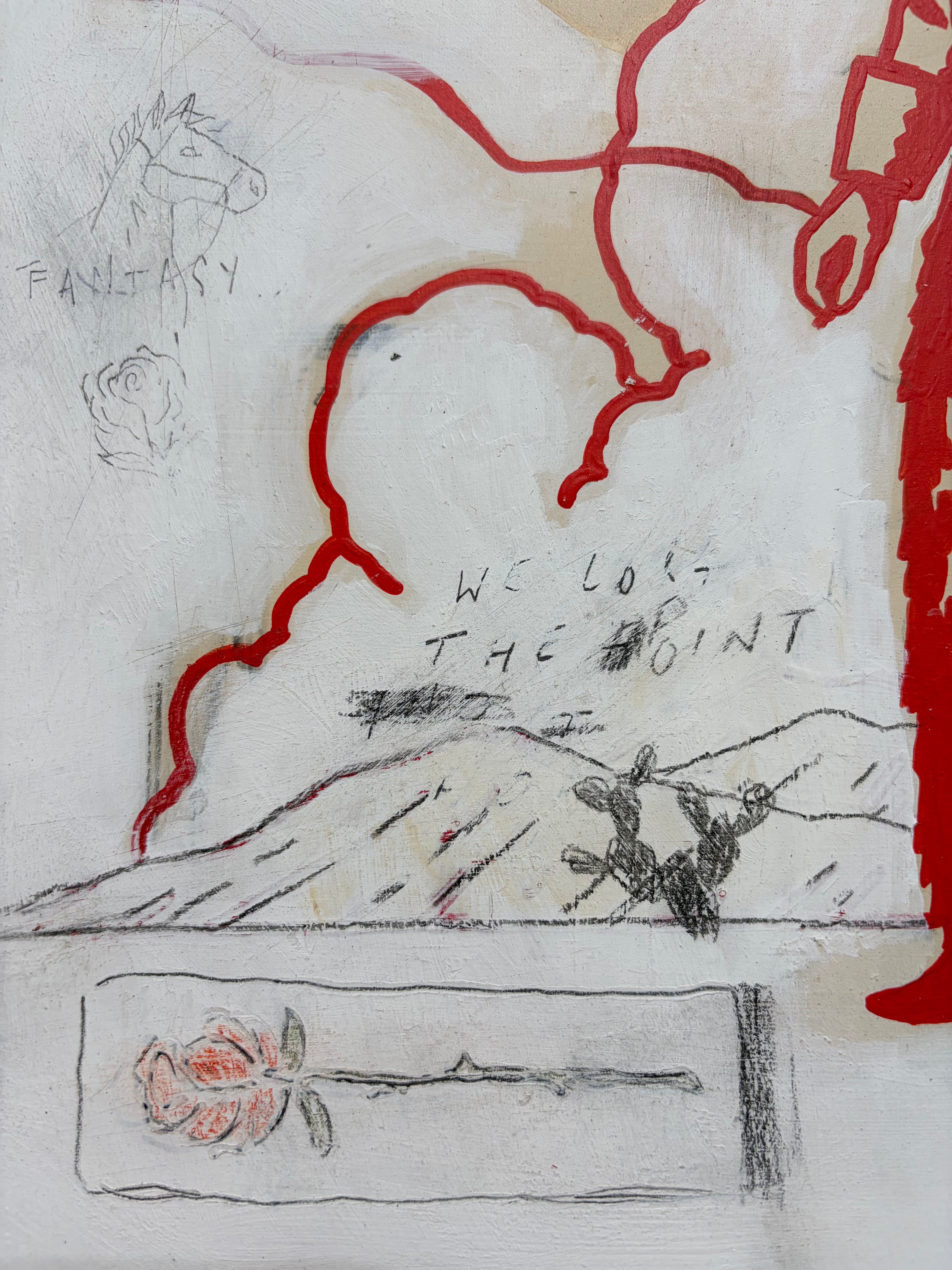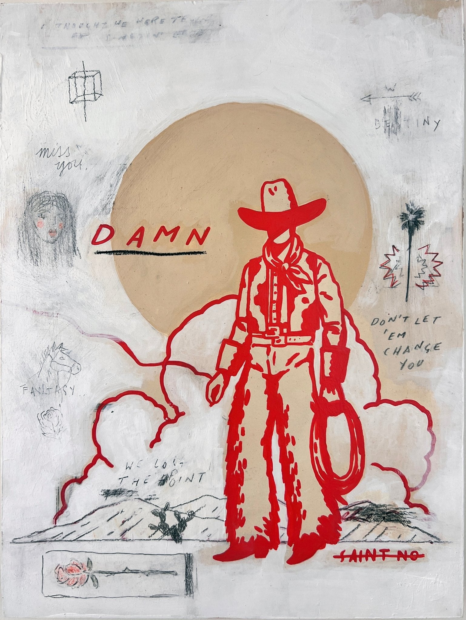 Acrylic, gesso, pencil, spray paint, colored pencil, enamel on canvas